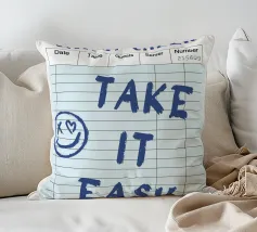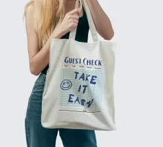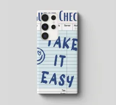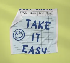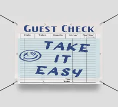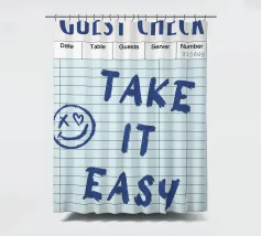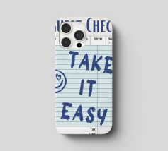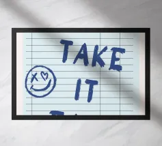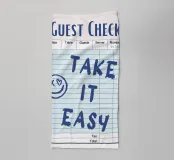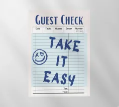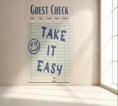 This charming digital poster creatively uses the familiar format of a diner guest check, titled "GUEST CHECK" at the top with sections for "Date," "Table," "Guests," "Server," and "Number." The main body features the comforting, handwritten-style message "TAKE IT EASY" in a bold blue, accompanied by a relaxed smiley face with a heart eye. The background is a soft, light blue, evoking a calm and nostalgic diner vibe. This high-quality digital poster, offered at 7000x5000 pixels and 300 dpi, brings excellent art and a laid-back, retro aesthetic to any space.