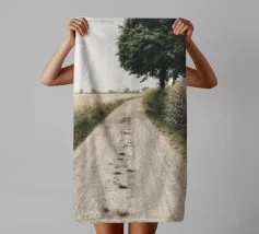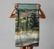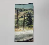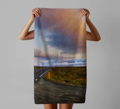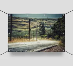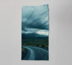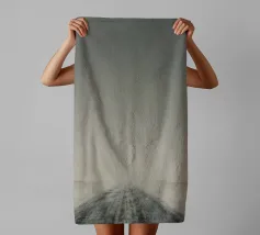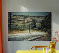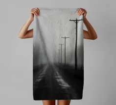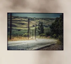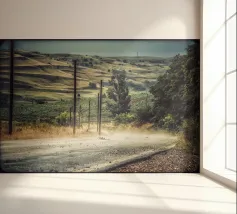 A haunting capture of a deserted road bending into the unknown. Wind lifts dust and mist across the asphalt, while distant terraced hills fade under a cloudy sky. A faint shaft of light breaks through, illuminating the swirling haze. The scene carries a cinematic, almost post-apocalyptic stillness—where time feels suspended and the road itself becomes the main character. Perfect for lovers of moody landscapes, minimalism, and atmospheric photography.