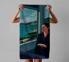 A view from a train window of a green, rolling countryside landscape. The scene is a peaceful, contemplative, and beautiful depiction of travel and the quiet joy of watching the world go by.
