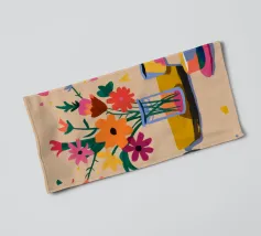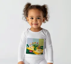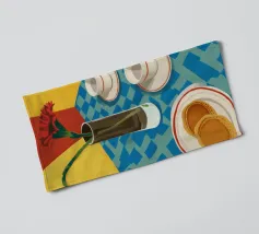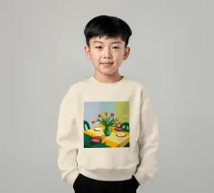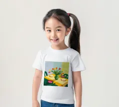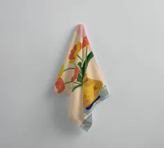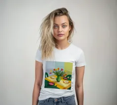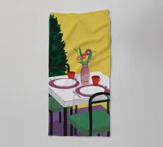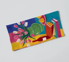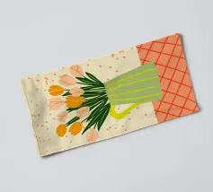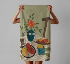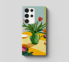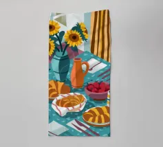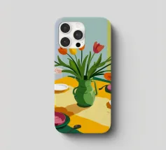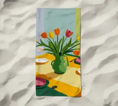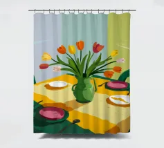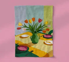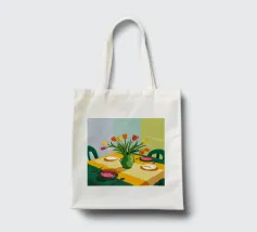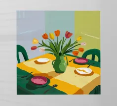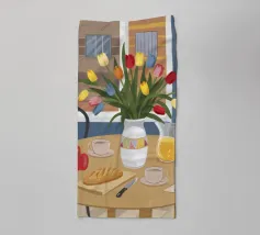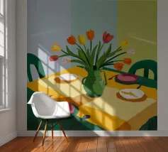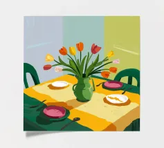 A peaceful interior scene of a kitchen table with a vase of orange tulips. Sliced fruit and bowls are neatly arranged on the yellow tablecloth, viewed from an angle that suggests a quiet, sunlit afternoon.