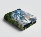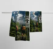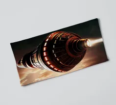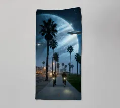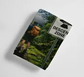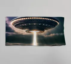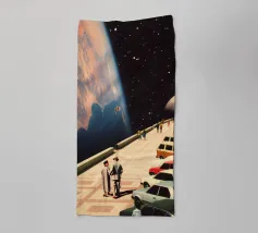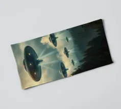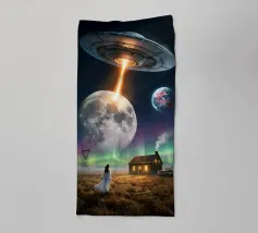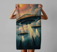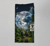 This imaginative artwork blends sci-fi wonder with natural beauty. Two hikers stand in a lush forest, staring up at Earth looming impossibly close in the sky as UFOs hover above, casting bright beams of light. A bold “Descent Zone” warning sign adds humor and adventure to the surreal scene. Rich details, cosmic elements, and a cinematic atmosphere make this piece perfect for fans of extraterrestrial art, fantasy landscapes, and unique wall décor that sparks curiosity and conversation.