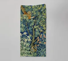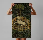 "Unicorn in Captivity" is a captivating tapestry from the late 15th century, part of the series known as "The Unicorn Tapestries." This piece depicts a unicorn enclosed within a fenced area, symbolizing purity and chastity. The intricate design features the mythical creature surrounded by lush foliage, flowers, and ornate details. The tapestry's vibrant colors and elaborate patterns reflect the rich textile artistry of the period and its symbolic significance in medieval culture.