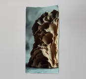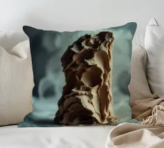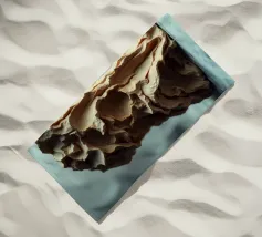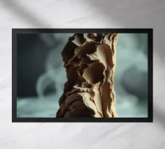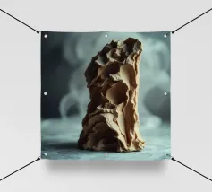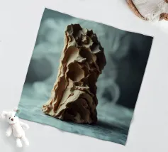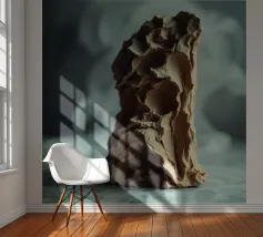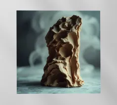 A stunning and unique sculpture stands prominently on a surface, emphasizing its rough textures and intricate details, illuminated softly to enhance its natural beauty.
