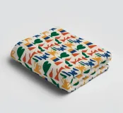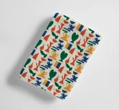 A colorful, repeating pattern consists of abstract shapes in hues of green, yellow, blue, and red. Each element forms a geometric arrangement that creates a vibrant, rhythmic visual effect.