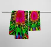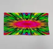 A captivating artwork features a central radial burst of vivid colors including pink, green, and purple. This abstract design creates a striking visual experience suitable for various artistic uses.
