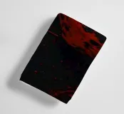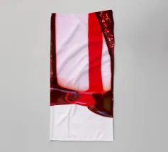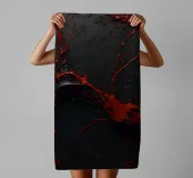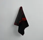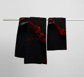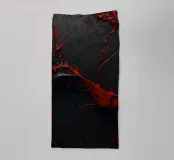 Bright red paint is splattered across a dark background, forming unique patterns and shapes. The contrast highlights the artistic expression and creates visual intrigue.