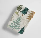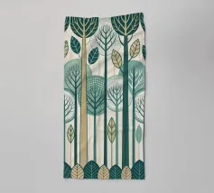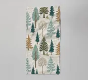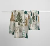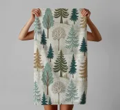 This beautiful, seamless pattern captures the peaceful and serene essence of a winter forest landscape. The design features a variety of hand-drawn evergreen trees, including pines, spruces, and firs, in a muted color palette of teals, browns, and deep greens. Interspersed among the evergreens are bare deciduous trees, adding depth and texture to the scene. The trees are set against a backdrop of soft, snow-covered hills with subtle, intricate patterns that give the impression of a crisp, winter day. This versatile design is perfect for creating cozy and charming products, from textile prints