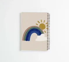 This minimalist illustration shows a rainbow and white clouds on a beige background, ideal for a child's or baby's room. In warm earthy colours, the sun boho design radiates friendliness and peace. Perfect for Scandinavian interior design, it brings a touch of nature into the home.