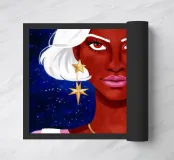 This artwork depicts a figure with white hair, set against a deep blue starry background. The figure is adorned with golden earrings, creating a celestial and beautiful atmosphere.