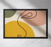 A minimalist design features a continuous black line weaving through colorful geometric shapes, including large circles in various shades. The background is a soft, neutral color that highlights the boldness of the abstract elements.
