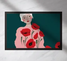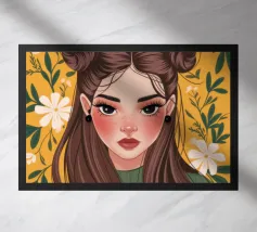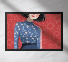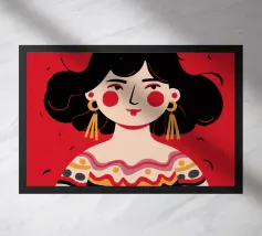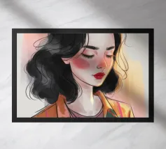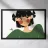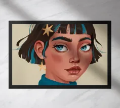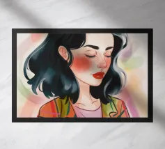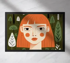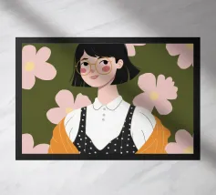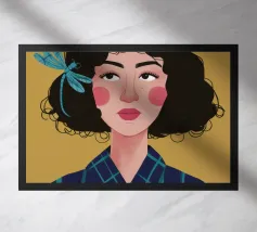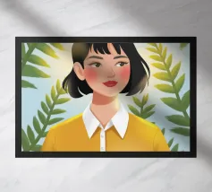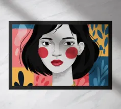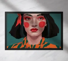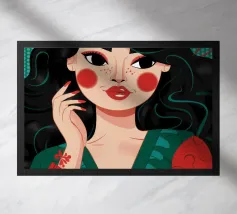 A simple, graphic portrait of a girl with a short black bob and rosy cheeks, wearing a green top, her expression direct and slightly sullen against a white background.