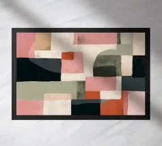 A sophisticated interplay of shape and balance, this geometric abstract artwork combines muted teal, blush pink, mustard, and cream tones to create a sense of calm structure and modern elegance. Clean lines intersect with soft color blocks, forming a rhythmic composition reminiscent of Bauhaus design. Ideal for contemporary interiors seeking a refined, architectural aesthetic.