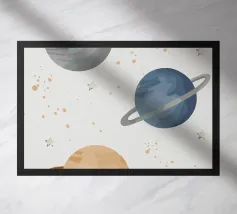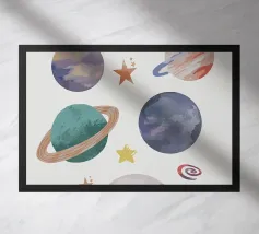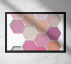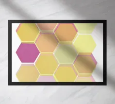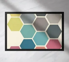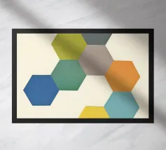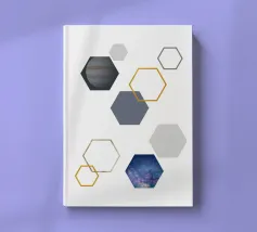 Hexagonal shapes of varying sizes feature different images, including a planet and a starry sky. The hexagons are arranged in a scattered pattern.