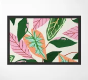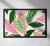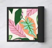 This vibrant artwork features a dynamic composition of tropical leaves in bold, contrasting colors. The piece showcases a mix of deep green, soft pink, and bright orange foliage, with intricate vein patterns adding texture and detail. The interplay of warm and cool tones creates a lively, energetic feel, while the clean, cream-colored background allows the leaves to stand out prominently. The stylized, graphic approach gives the artwork a modern and playful aesthetic, evoking the lush beauty of nature in a contemporary design.