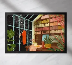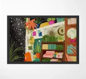 books bookshelf reading plants greenery potted plants bookshelf decor books on shelves woman reading indoor plants book lover hanging plants cosmos stars night sky interior relaxation cozy corner astronomy decor celestial theme