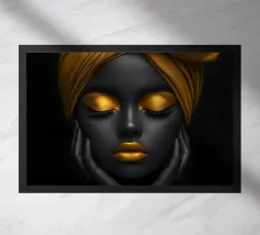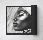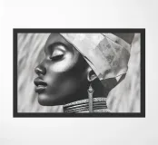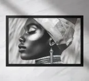 A striking black and white portrait of an African woman in side profile, adorned with elegant jewellery, emphasises her stunning features. The grainy texture of the image emphasises the strength and beauty of the fashion, captured in a modern, mesmerising style.