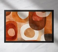 Bold, overlapping circles in navy and orange create a dynamic pattern against a light background. Their rough, textured edges lend a sense of movement and energy.