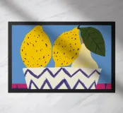 A modern still life of two yellow pears in a bowl with a bold, black and white zigzag pattern. The pink and purple checkered background adds another layer of playful, graphic design to the composition.