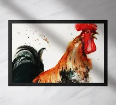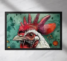 A fineliner and watercolor marker drawing of a chicken. She is white and black and red.