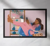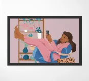 The painting shows a person in a pink outfit, lounging in a chair with legs propped up, holding a phone. The background includes a shelf with plants and books, evoking a sense of relaxed creativity.