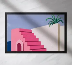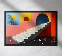 A dramatic architectural piece featuring a long pink staircase ascending towards a bright yellow sun or moon against a dark blue sky. The composition is bold, minimalist, and powerfully symbolic.