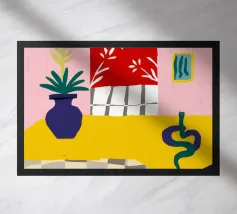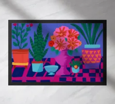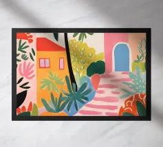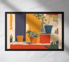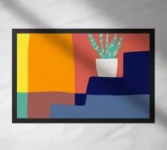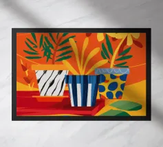 An abstract illustration shows a colorful staircase adorned with a variety of potted plants, blending architecture and botany in a vibrant, modern composition.